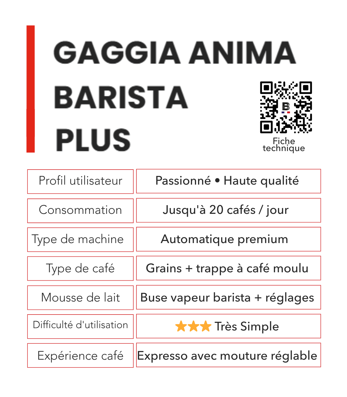 La Gaggia Anima Barista Plus est une machine à café automatique conçue pour répondre à toutes vos envies. Son réservoir de 1,8 L et son bac à grains de 250 g, associés à des dimensions pratiques (L 22 × H 43 × P 33,3 cm), en font un modèle adapté à une utilisation quotidienne.