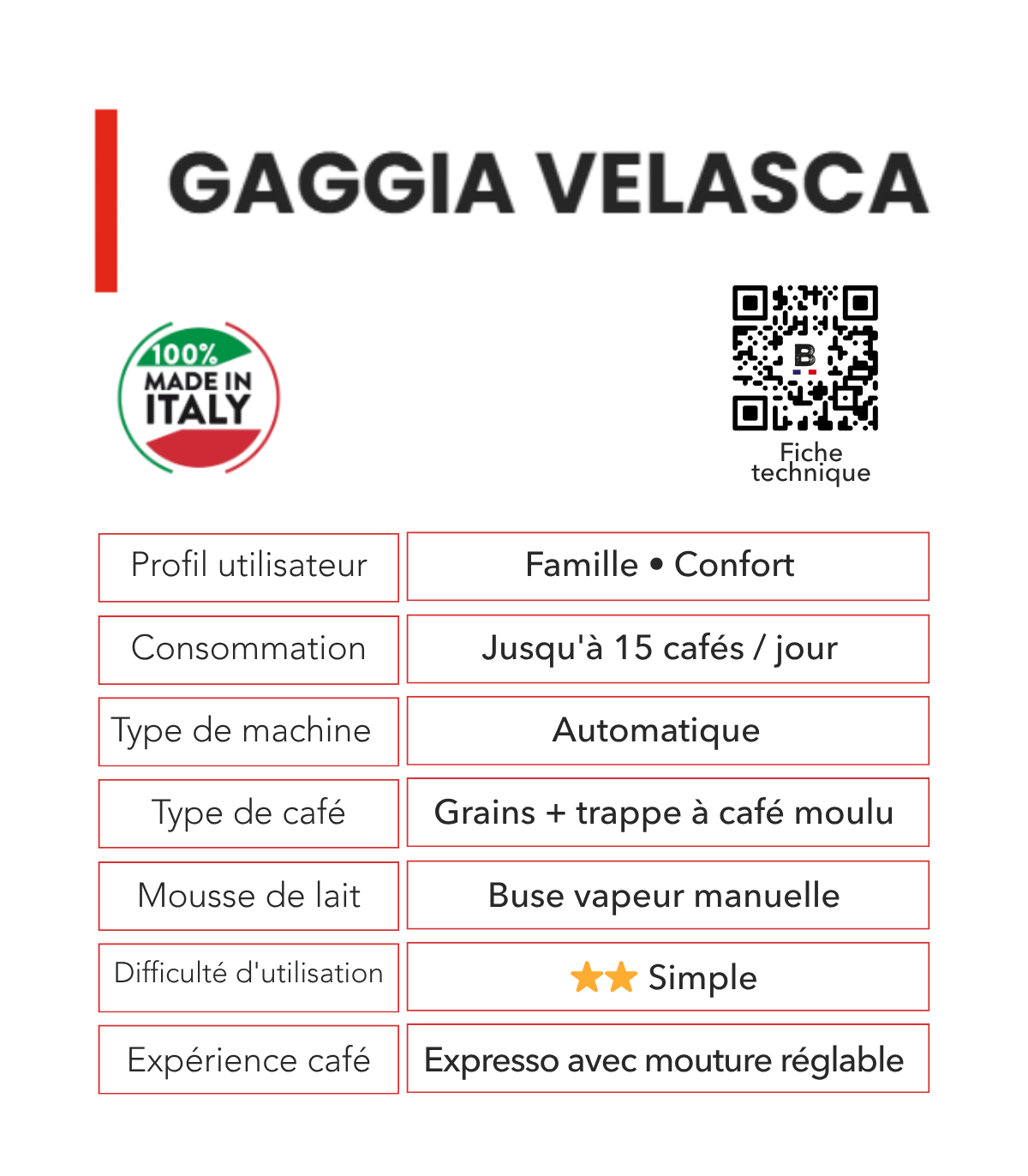 La Gaggia Velasca Black allie performance et simplicité pour une expérience café authentique. Son réservoir de 1,5 L et son bac à grains de 300 g offrent une belle autonomie, tandis que ses dimensions compactes (L 25,6 × H 34 × P 44 cm) s’intègrent facilement dans tous les espaces.