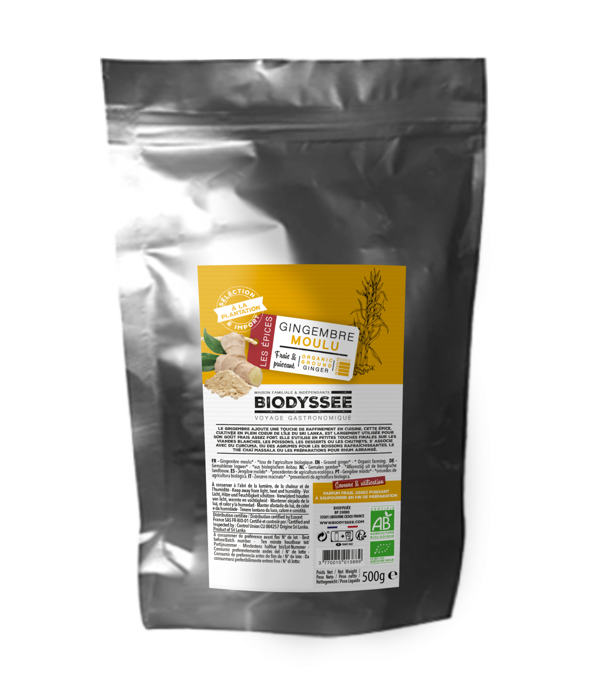 Notre gingembre bio s'utilise en petites touches finales sur les viandes blanches, les poissons, les desserts ou les chutneys. Il s’associe à merveille avec du curcuma ou des agrumes pour les boissons rafraichissantes, le thé Chaï massala ou les préparations pour rhum arrangé.